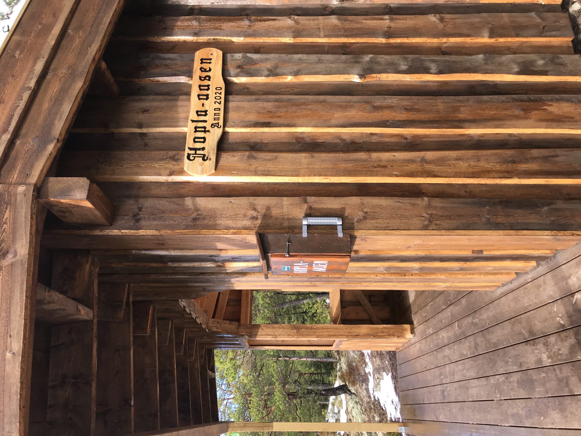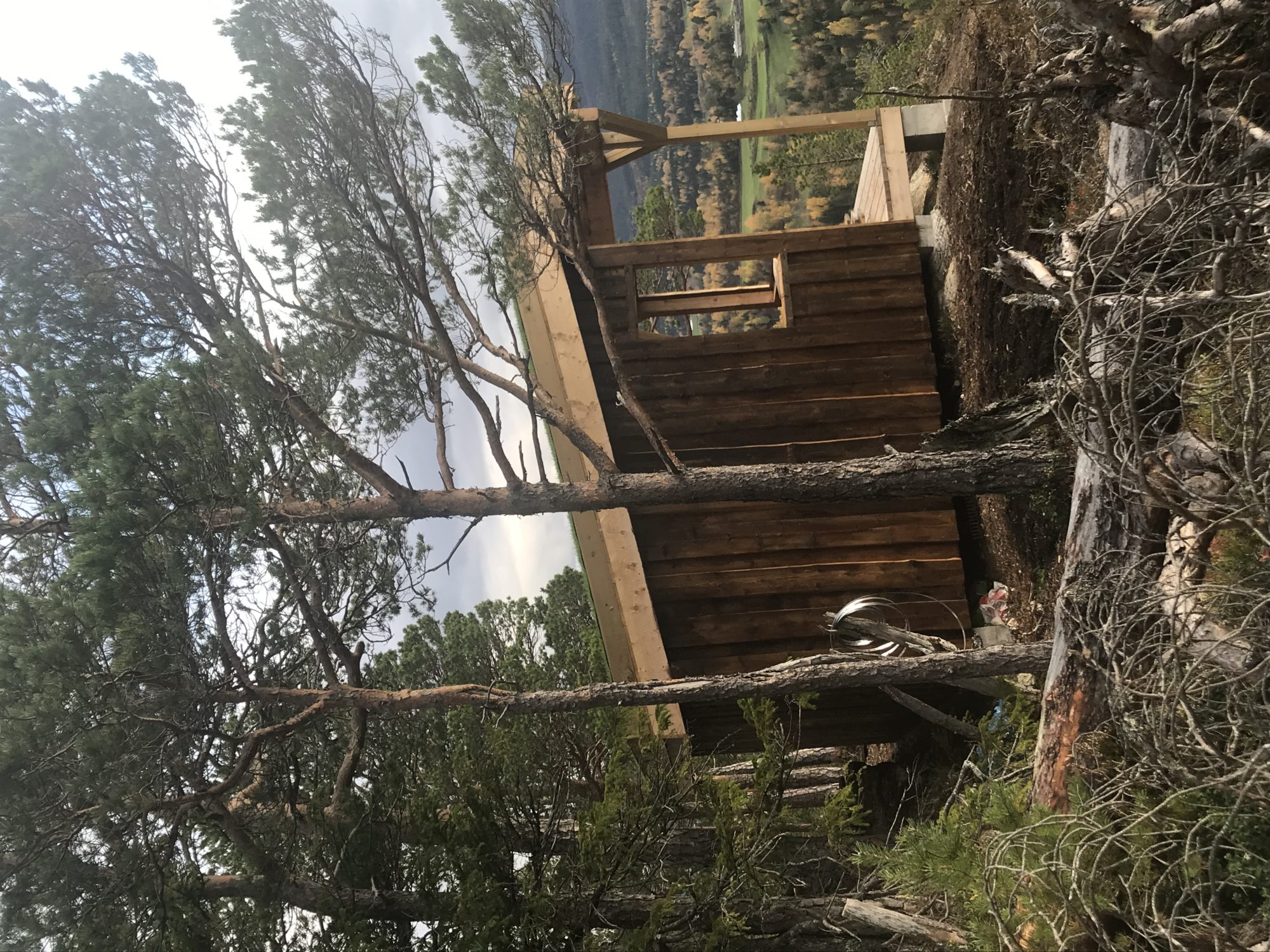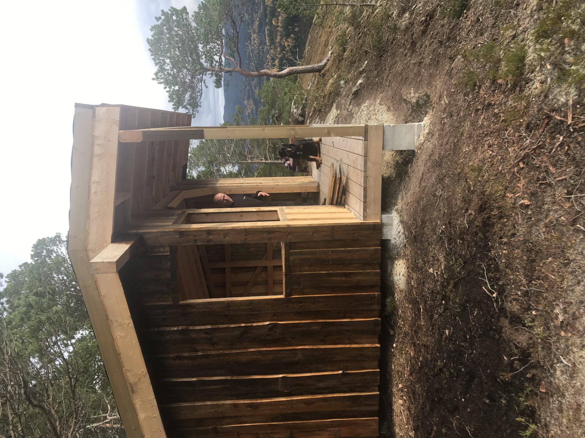 Kassen henger på et tre ved en Platt som skal bli en gapahuk. Her er det lagd to benker for å sitte på. Vær obs! Her er det bratt ned på kanten!!!