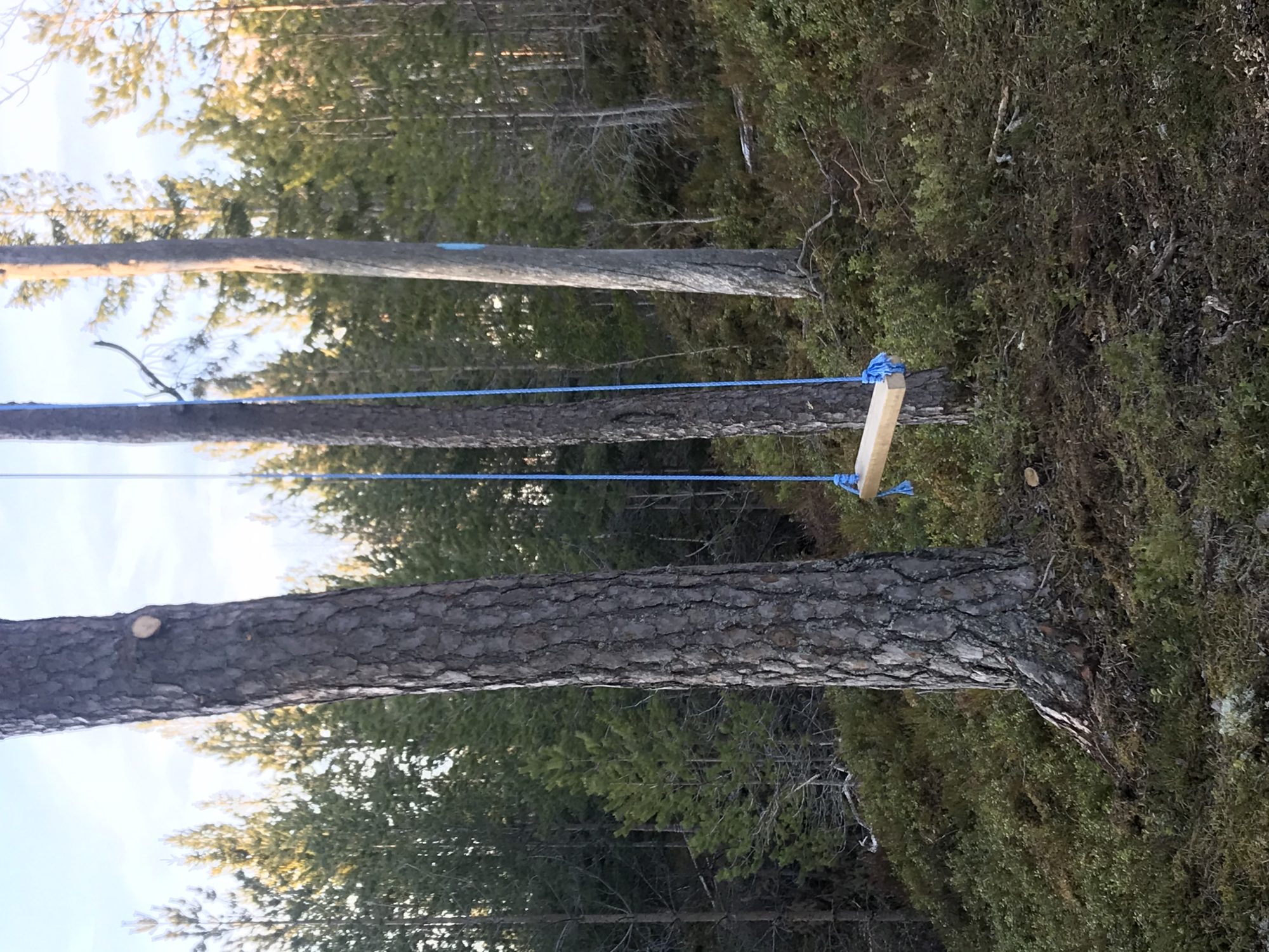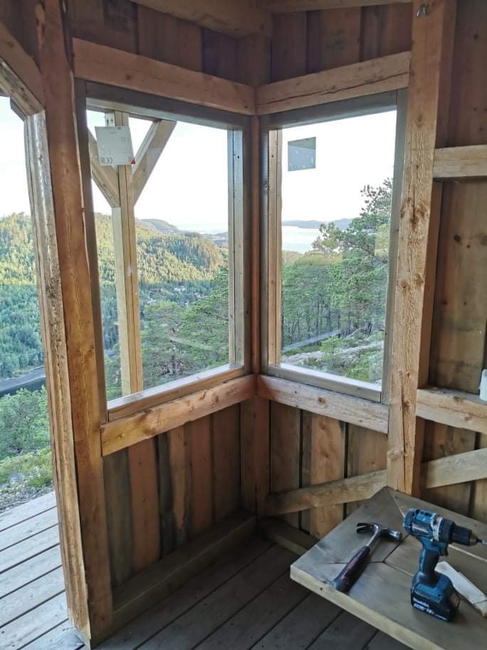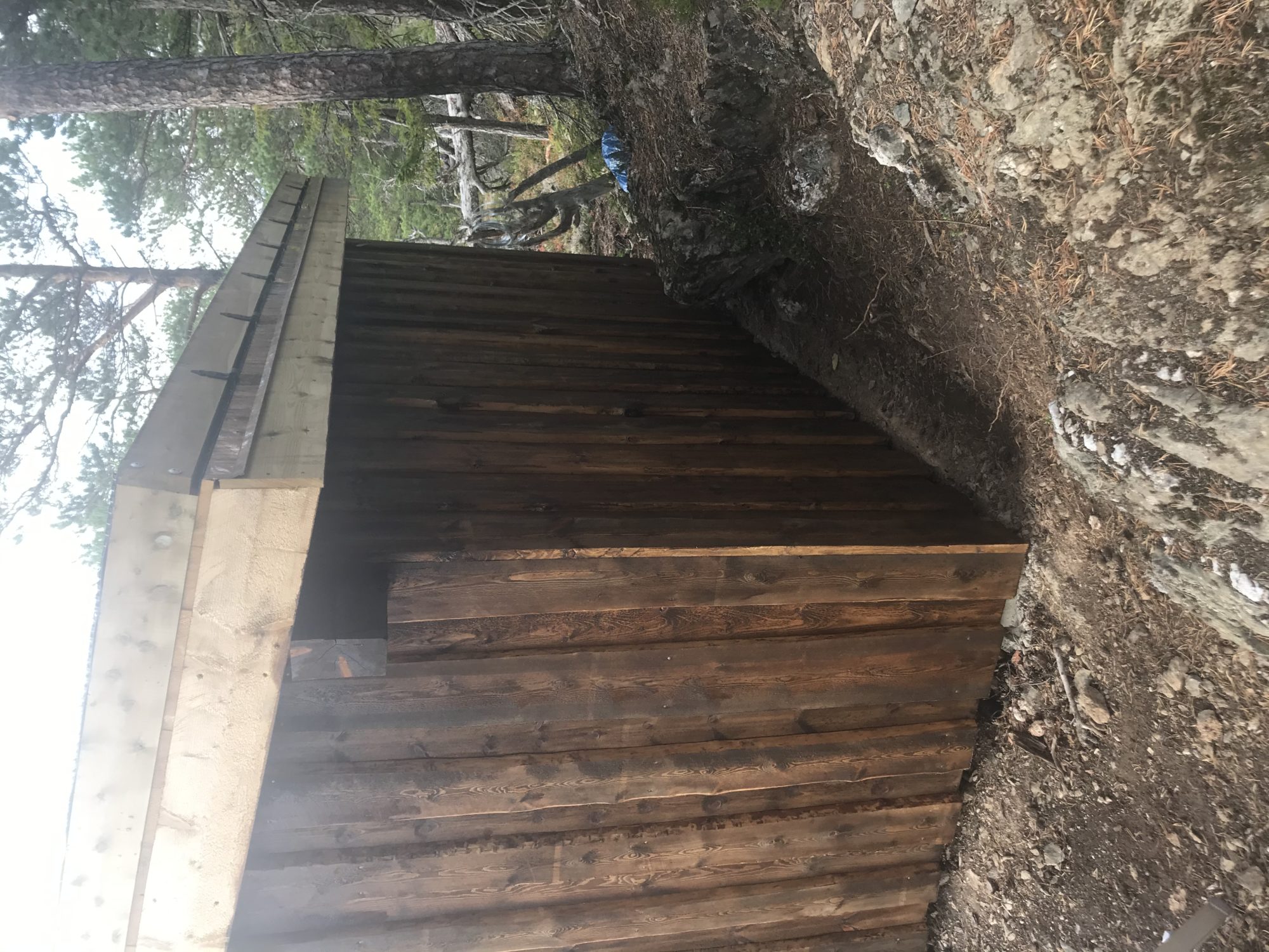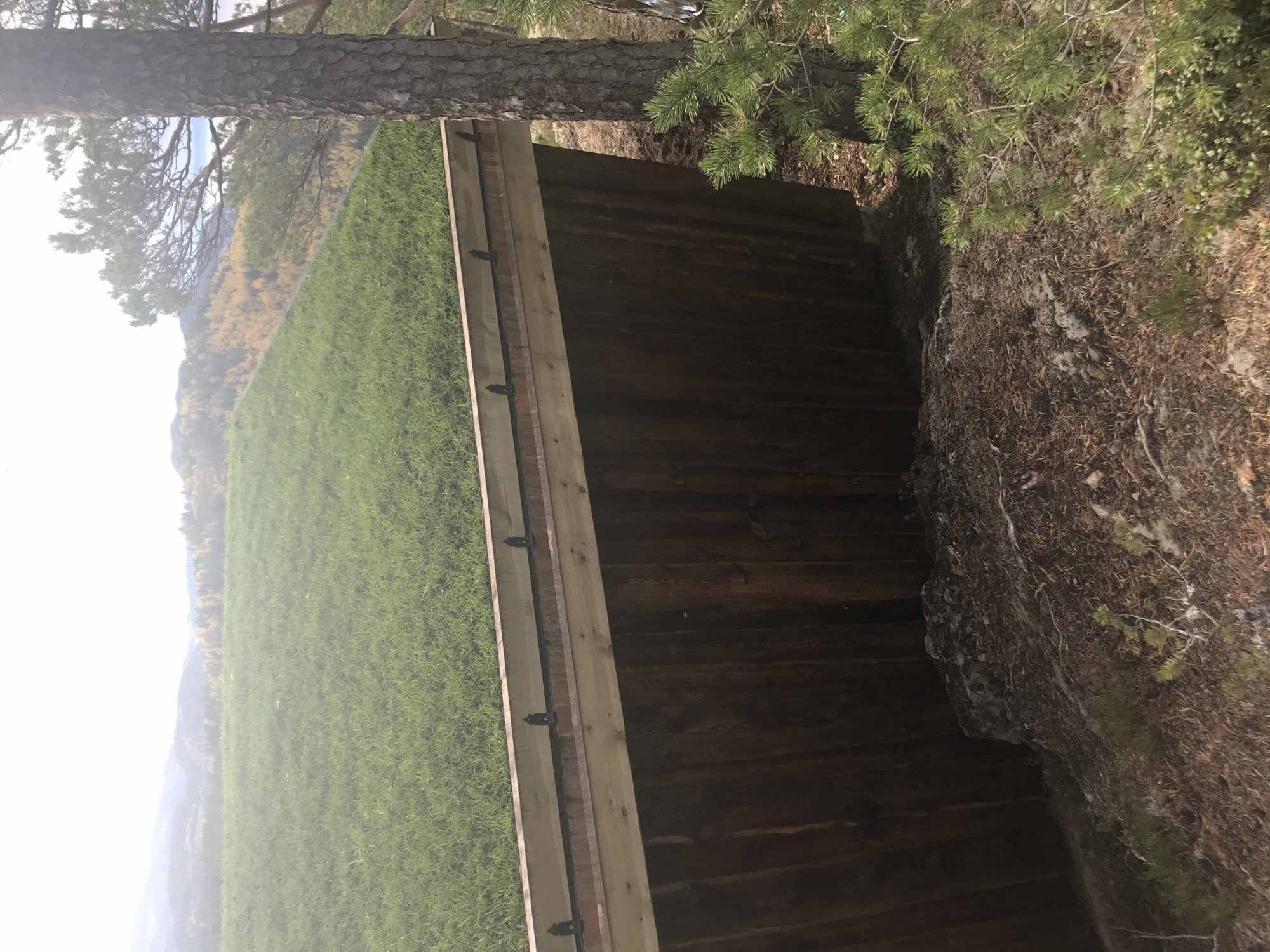 Kassen henger på et tre ved en Platt som skal bli en gapahuk. Her er det lagd to benker for å sitte på. Vær obs! Her er det bratt ned på kanten!!!