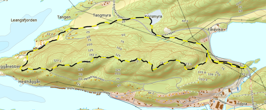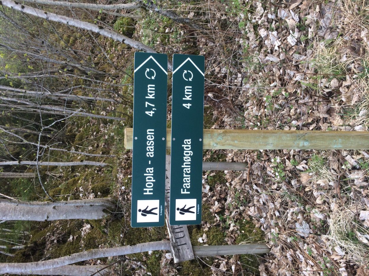 Etter et stykke skal dere ned en bratt sti med flere steiner, så pass på. Nå kommer dere ned til en vei, Paradiset hyttefelt, her skal dere gå til høyre. Følg veien til dere kommer til en ny sti. Stien går innover til du kommer til en bratt bakke med et tau. Gå ned bakken. Nå skal dere gå til høyre mot Faara hyttefelt. Følg stien til dere kommer til et hokstfelt og gå så mellom to hytter til veien. Gå til høyre etter hyttene og følg veien til dere kommer til Frostaveien. Her skal dere krysse veien, se dere godt for her!!! Her skal dere følge traktorveien til dere kommer til en ny blå pil, så inn til venstre inn i skogen. Her kommer dere på Faarahøgda stien. Ønsker du en ca 2,5 km lengre tur kan du gå rett fram til Faarahøgda. Synes du Hopla-Aasen turen har vært lang nok, går du gjennom skogen til Frostaveien igjen. Gå til venstre og gå i grøfta oppover. Nå må du krysse Frostaveien igjen!! Pass på her å!!! Følg så stien, som er samme som Faarahøgda tilbake. Kryss Frostaveien for siste gang og turen er ferdig!