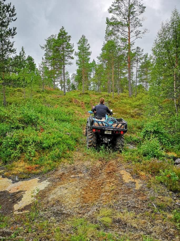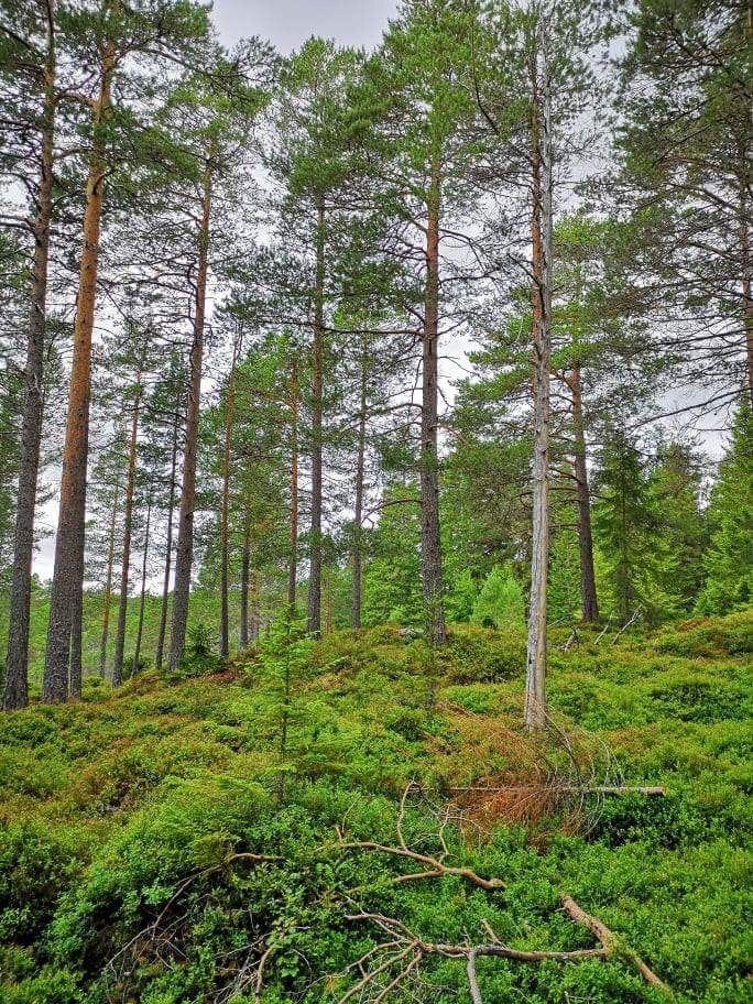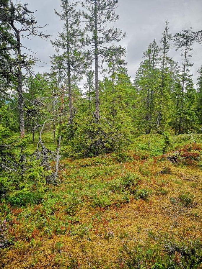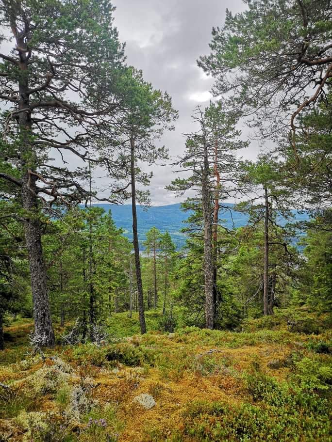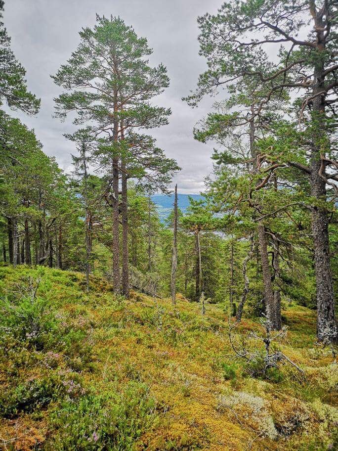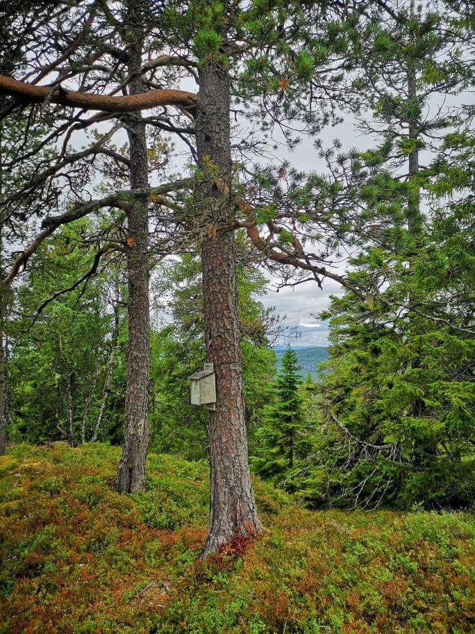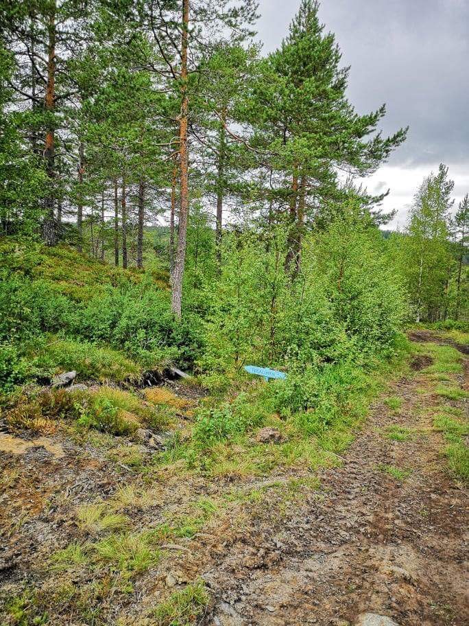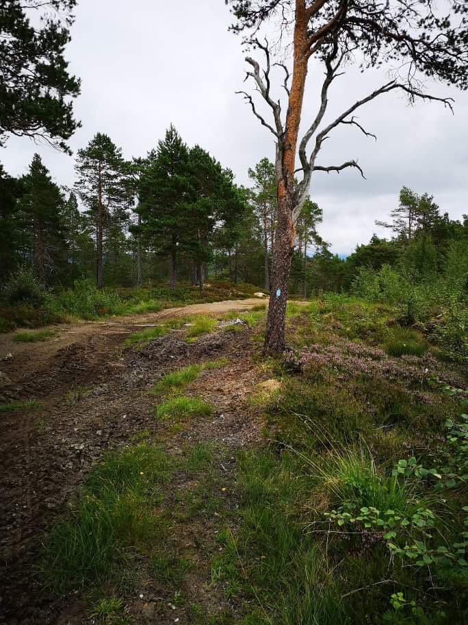 Turen går først etter en skogsvei. Følg denne veien i ca 2 km. (Etter ca 500 meter kommer du til en blå pil, Okstjønna. Her kan du ta en kortere tur eller en avstikker. Ved okstjønna er det gapahuk og benker. Veldig fint. Ingen kasse)