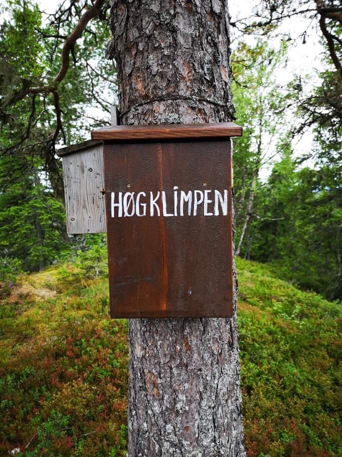 Når du nå har gått lengre etter traktorveien kommer du til en ny blå pil: Høgklimpen. (Rett fram ligger da Åltjønnin. 3 små vann.) turen går videre opp til venstre. Nå er traktorveien slutt og det er skogsterreng og myr. Her går vi etter Rognlan il sin skiløype trasse. Høgklimpen kan mann gå til både sommer og vinter!!! Veldig fin natur å gå i. Lyst og åpent! Ser mange trær som har vridd seg. Turen er merket godt med blå maling på trær, pinner og blå heng i trær. Når myra er bløt er det lurt å gå i kanten eller over små hauger. Her er det slak stigning hele veien med noen bakker. Når du kommer mot slutten møter du på en grå høy kasse. Det er Rognlan il sin ski kasse, skriv deg gjerne inn her.