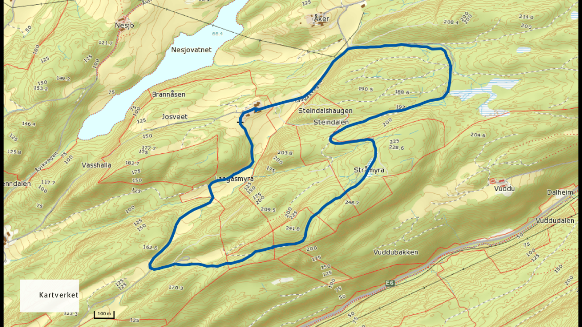 Kjør veien over Vold, ta av mot Åker 2,5 km. Kjør til gården til Odin Langås, som er i enden av veien, og parker ved fjøset. Gå tilbake ned veien du kom. Følg blå merker som henger i trærne. Følg grusvei ca 700 meter, gå inn til høyre og følg grusvei opp bakken. Etter ca 1,3 km blir det slutt på grusvei, gå videre innover i skogen. Etter ca 3 km kommer du til kassen som henger i et tre på venstre side. Der ser du utover fjorden, med bl.a Steinvikholmen. Følg «stien» videre ned bakken. Så kommer du til traktorvei som du følger til veien deler seg. Gå til høyre og følg veien tilbake til bilen. Kan sykles om du liker terrengsykling.