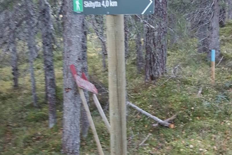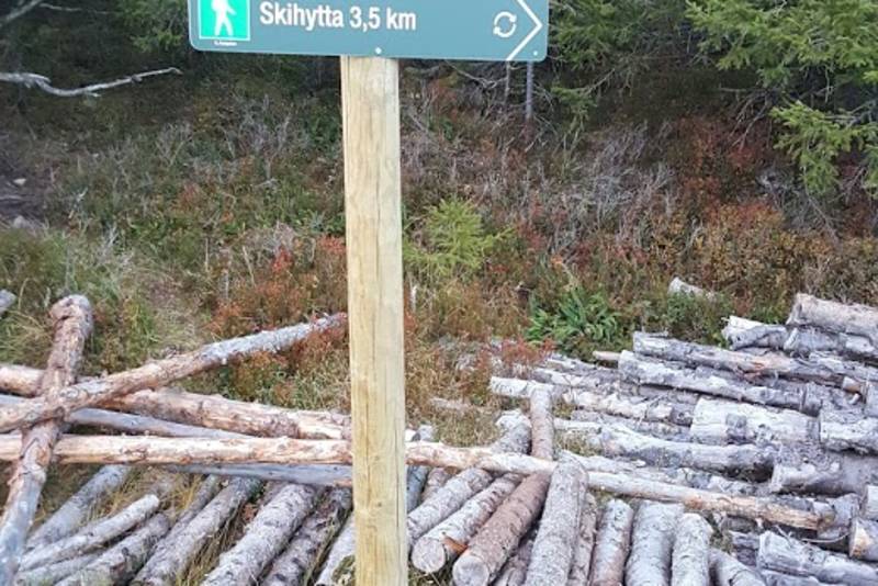 Du passerer Beitfeltet og kommer ned til veien til Beitfeltet. Ta til venstre og følg veien fram til Skihytta.