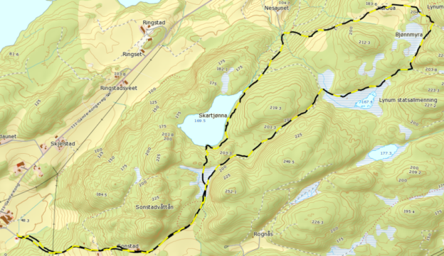 Gå opp bakken mot Sonstad. Litt bratt bakke, men veldig fin utsikt. Følg veien helt til den går over i skogsvei/ sti. Følg stien merket med blå pinner innover skogen. Når du kommer frem til Skardtjønna, er trimkassen på høyre side av tjønna. Her er det også benker hvor du kan sitte ned og hvile, og nyte naturen rundt deg. Følg vannet videre, til du kommer til en demning. Deretter blir det traktorvei i skogen, til du kommer på stien mot Sonstad. Gå ned bakken til turens utgangspunkt.