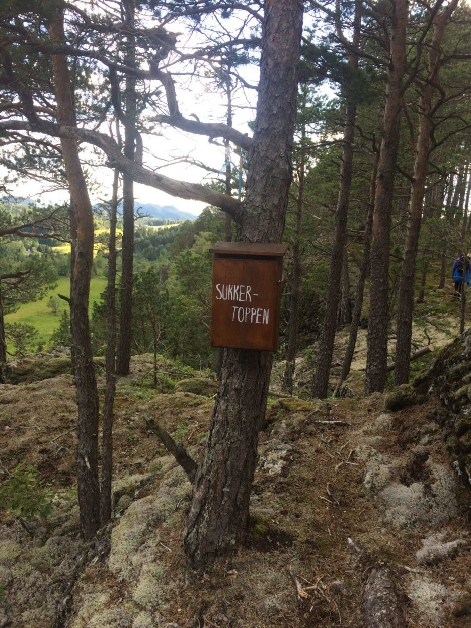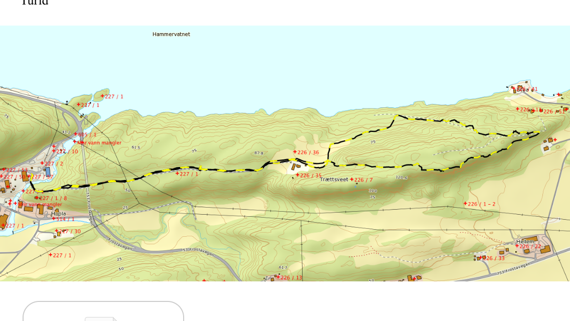 Om du går nedover åkeren er dette den letteste veien. Etter åkeren kommer du til et hokstfelt og en traktorvei. Her er det fin utsikt utover Hammervatnet. Følg traktorveien oppover og litt nedover til du kommer til en blå pil. Her skal du gå inn til høyre. Følg stien gjennom skogen. Nå går du oppover igjen. Det er to plasser der det er et tau å holde i. Kassen er på toppen, henger på et tre. Her er det fin utsikt utover Åsenfjord og feltet. Følg stien videre til du kommer til en benk. Her går du til høyre mot hokstfeltet. Følg hokstfeltet tilbake til åkeren og Tretsve. Da har du kommet deg i rundt. Gå veien tilbake til bilen.